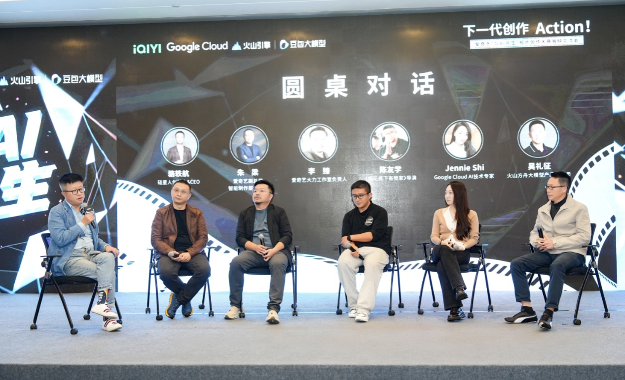 作为本次大赛评委,AI行业资深媒体人——硅星人创始人兼CEO骆轶航受邀来到现场,担任本次圆桌对谈的主持,与Google Cloud AI技术专家Jennie Shi、火山方舟大模型产品架构师吴礼征以及爱奇艺副总裁、智能制作部负责人朱梁、爱奇艺大力工作室负责人李臻、大赛冠军《烟花底下有我家》导演陈友学共聚一堂,围绕"AI是工具、伙伴,还是新导演"这一议题,展开了一场围绕AI创作与影像未来的深度对话。