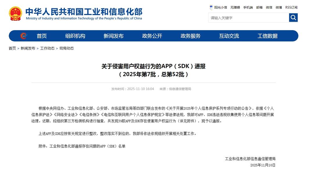 通报显示,根据《关于开展2025年个人信息保护系列专项行动的公告》,依据《个人信息保护法》《网络安全法》《电信条例》《电信和互联网用户个人信息保护规定》等法律法规,工业和信息化部对APP、SDK违法违规收集使用个人信息等问题开展治理。近期,经组织第三方检测机构进行抽查,共发现39款APP及SDK存在侵害用户权益行为。