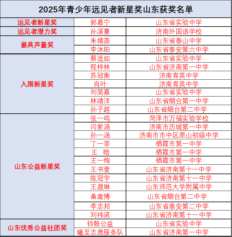 在2025年远见者新星奖评选中,组委会在全国评选出慈善大使2名、远见者新星奖10名、远见者潜力奖20名、最具声量奖5名、杰出公益社团奖5组,以及部分入围新星奖。其中山东青少年有1人获得远见者新星奖,1人获得远见者潜力奖,2人获最具声量奖,7人获入围新星奖。