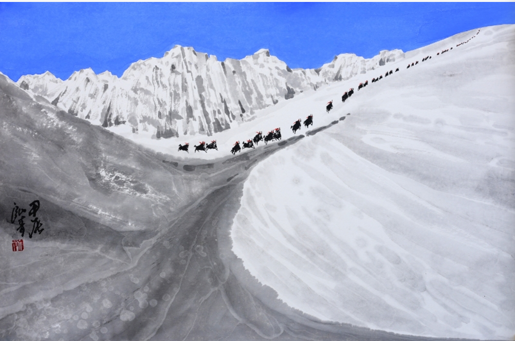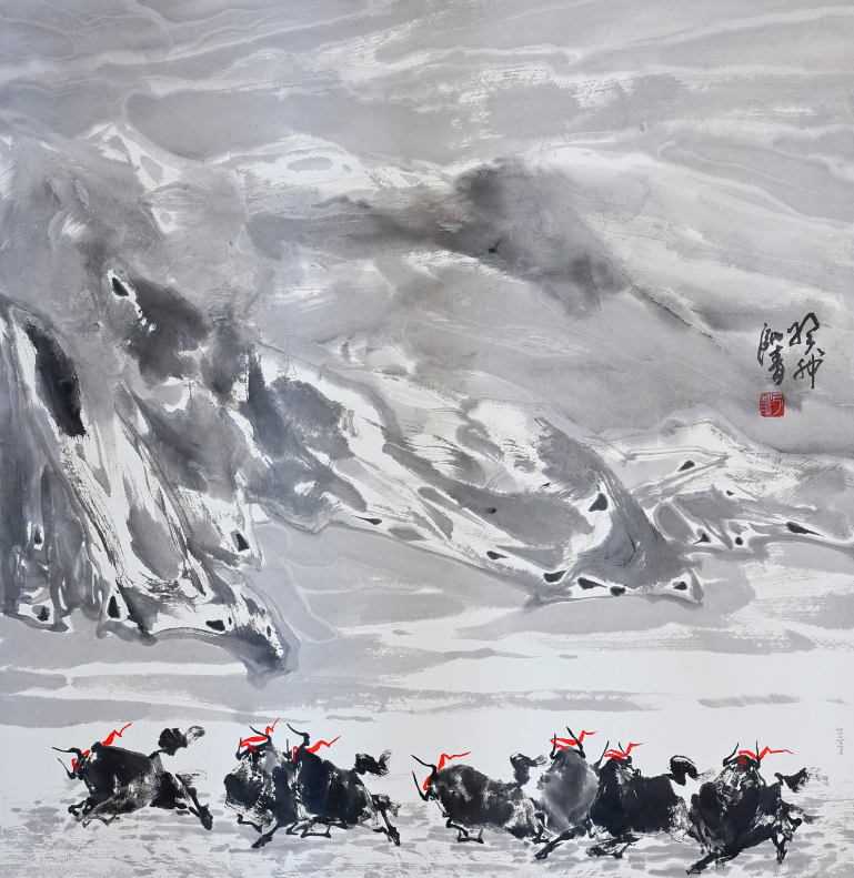 其次,他笔下的牦牛都是富于动感的。奔跑中的动物比呆立不动的,要难画得多,前者拥有运动的逻辑,许多元素因移动而发生变化,不是那种专门等人描摹写生的模特儿牛。即使凝立于荒山大雪中的静态牦牛,也能看到与大自然抗争的生存意志,让人感叹生灵的倔强与坚强。