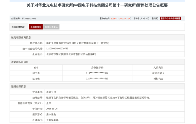 存在违规失信行为,华北光电技术研究所被暂停军队采购资格