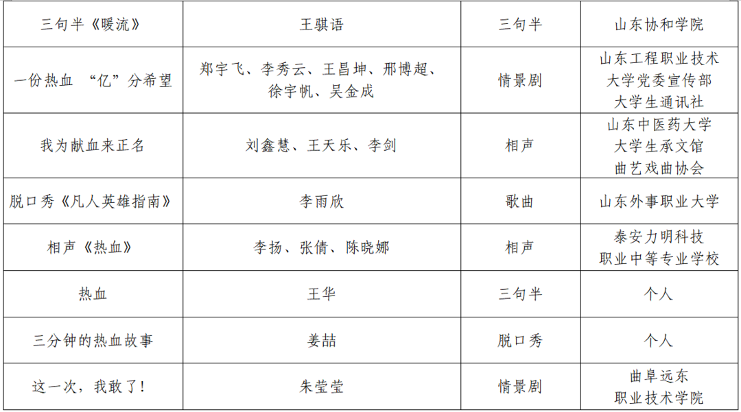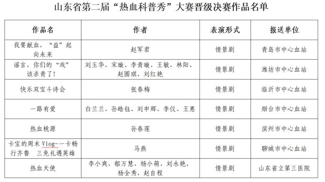 作为山东省献血特色科普品牌,“热血科普秀”大赛自启动以来,便以“让献血知识‘活’起来”为核心,吸引了全省各地血站、医疗机构、高校的积极参与。山东省第二届“热血科普秀”大赛,严格遵循“科学严谨、形式创新”的原则,经专家审核初评、网络展播、集中复审等环节,从全省百余个参赛作品中遴选出15部作品晋级决赛。这些作品涵盖情景剧、三句半、相声、脱口秀等表演形式,由省内各地血站、医疗机构、高校及个人报送,内容聚焦无偿献血政策解读、健康知识科普、认知误区澄清等核心主题,兼具专业性与传播性。