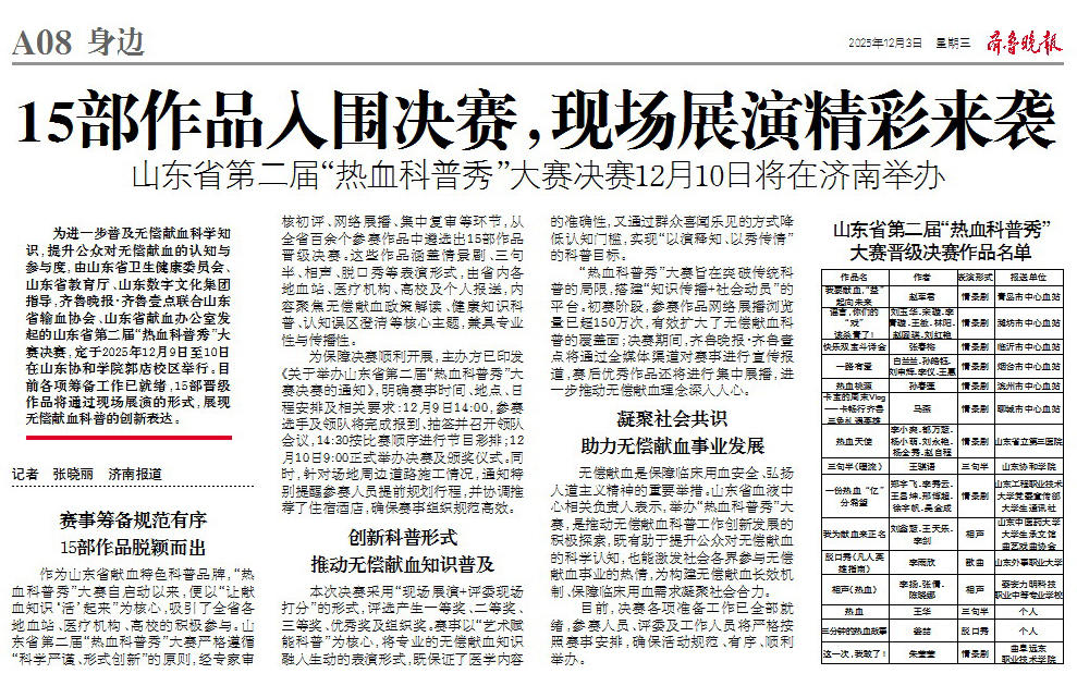 为进一步普及无偿献血科学知识,提升公众对无偿献血的认知与参与度,由山东省卫生健康委员会、山东省教育厅、山东数字文化集团指导,齐鲁晚报·齐鲁壹点联合山东省输血协会、山东省献血办公室发起的山东省第二届“热血科普秀”大赛决赛,定于2025年12月9日至10日在山东协和学院郭店校区举行。目前各项筹备工作已就绪,15部晋级作品将通过现场展演的形式,展现无偿献血科普的创新表达。