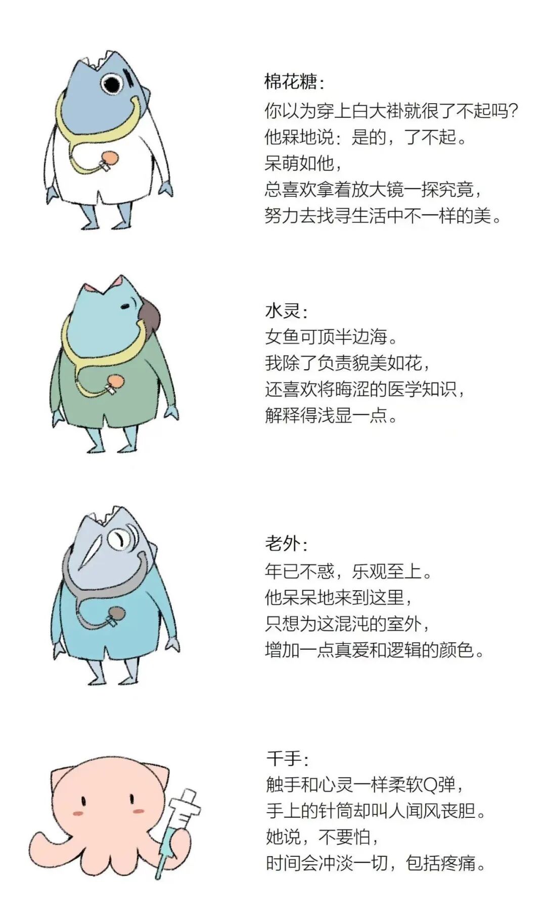 作为威海市立医院倾力打造的健康科普IP,《鲁威渔医号》自2020年推出以来,始终以“让医学知识更易懂、让健康理念更亲民”为核心,此次获奖作品更是延续了品牌一贯的创作特色—— 创团队深度融合威海海洋城市基因,设计了以蓝鲅鱼 “棉花糖”、美鲅鱼“水灵”、鲅老爹“老外”、章鱼“千手”为核心的卡通矩阵,用群众熟悉的海洋生物形象搭建医学与大众的沟通桥梁。系列漫画聚焦百姓健康需求,从传染病防护、疾病科普、慢病管理以及网络辟谣等入手,将晦涩的医学知识转化为幽默生动的故事情节,目前已连载120余期,累计点击量超百万,成为医院“精致医院”建设中健康宣教的重要载体。