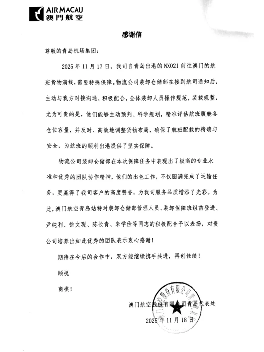 从航司肯定到货主信任,从旅客提取行李时的便捷体验到特殊货物的安全送达,未来,青岛机场将聚焦客户核心诉求,持续深化与航司的协作,在流程优化、技能提升、服务细节上持续发力,让每一次出行、每一批货物运输都更快捷、安心。