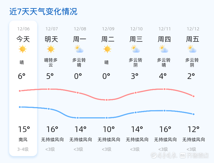 今天是12月6日,星期六,农历十月十七。济南市迎来晴朗天气,全市各区均为晴天,气温介于6℃至15℃之间,东南风1级,空气湿度为41%,PM2.5指数为87,空气质量良好。市民朋友们可以趁着晴好天气,出门享受冬日的阳光。