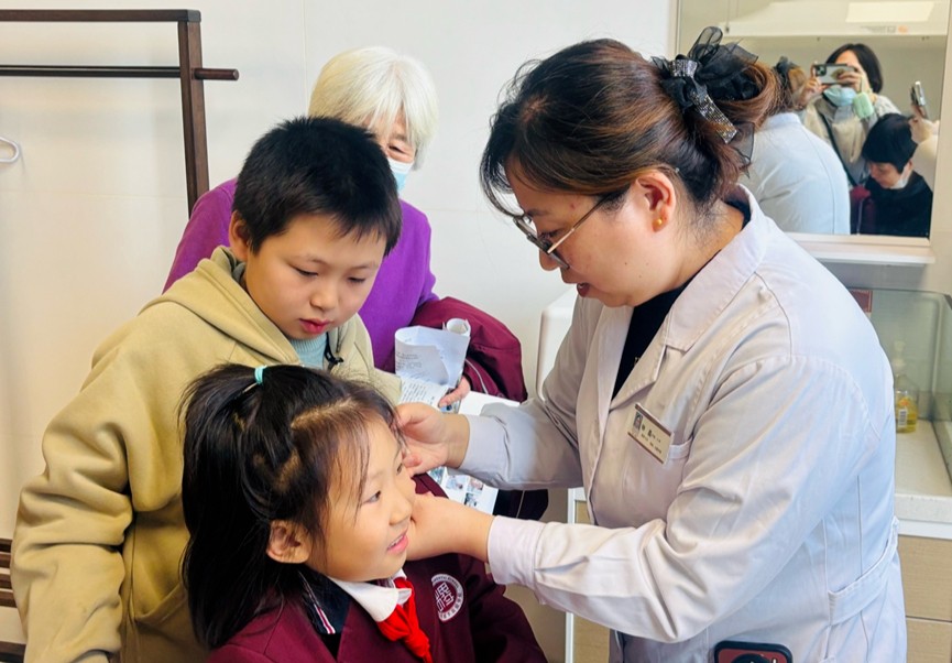 随后,医生为学生们揭秘“人体的神奇按钮”——穴位。迎香穴、合谷穴、风池穴……这些应对感冒的“明星穴位”引起了孩子们的浓厚兴趣。“找找你的按钮在哪?”互动环节中,孩子们在医生指导下互相寻找穴位,眼睛里充满了好奇。