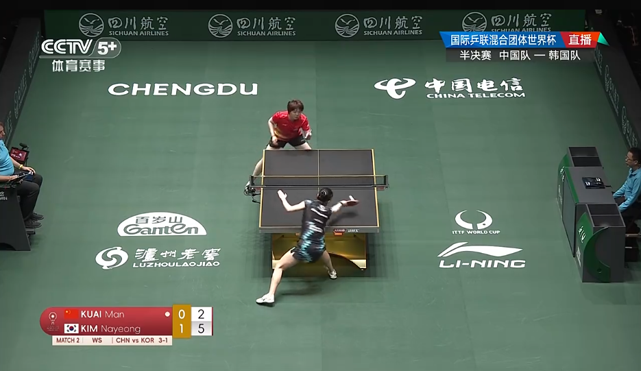 第四场女双比赛,蒯曼/王曼昱1-1战平李恩惠/崔孝珠,两局比分为:5-11、14-12。最终,中国队大比分8-3击败韩国队。