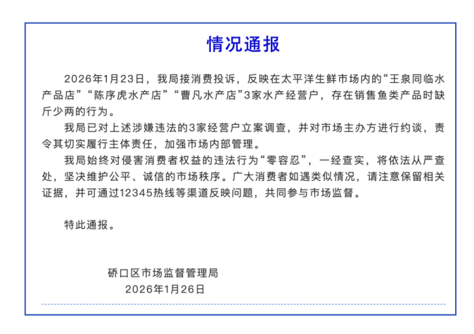 相较于零食市场的计量问题,生鲜水产市场的缺斤少两现象更为突出,1月23日,武汉市硚口区市场监督管理局接到消费者投诉,反映该市场内 “王泉同临水产品店”“陈序虎水产店”“曹凡水产店”3家水产经营户销售鱼类产品时存在缺斤少两行为。