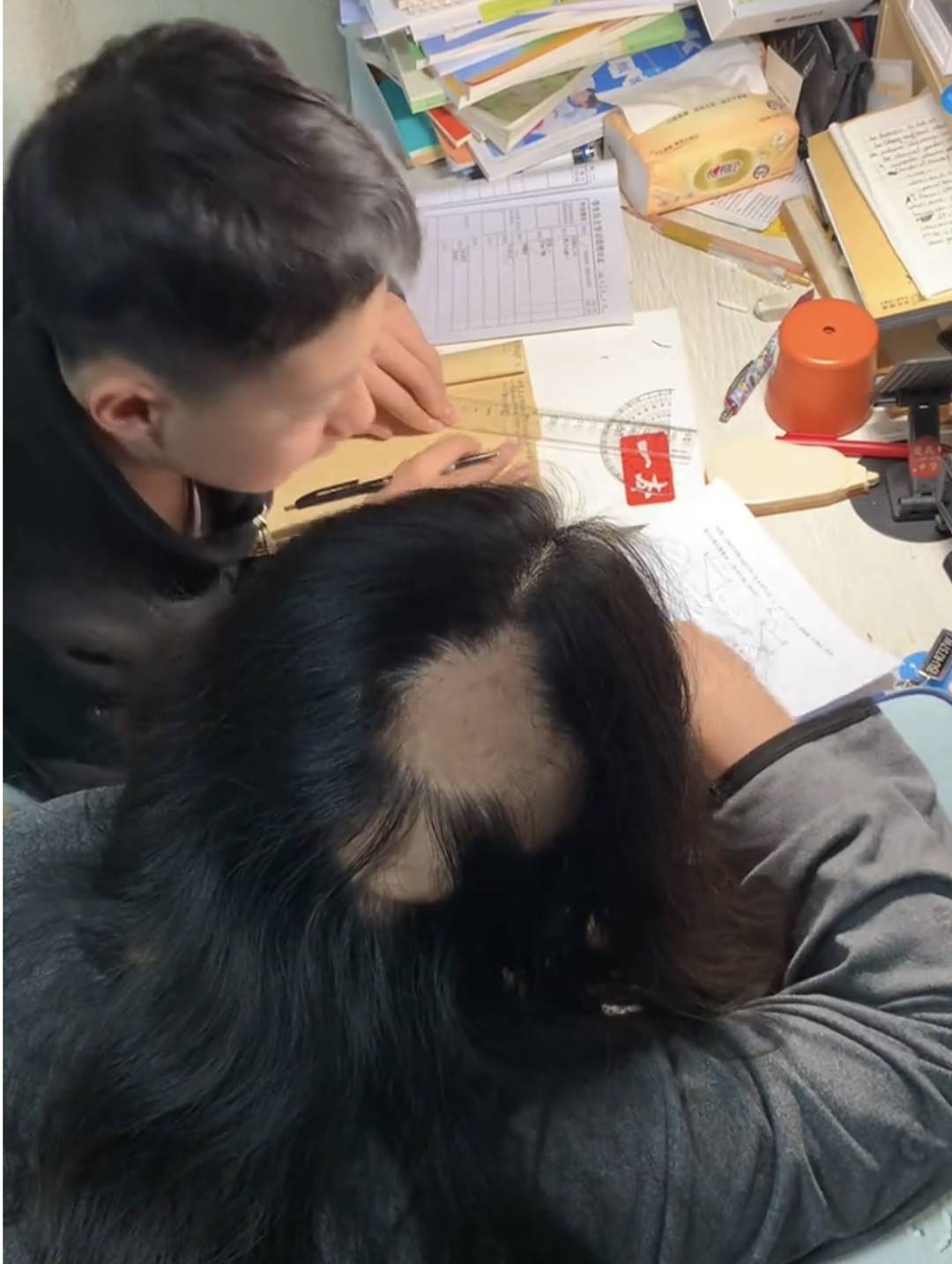 已经斑秃的肖女士在辅导儿子功课。