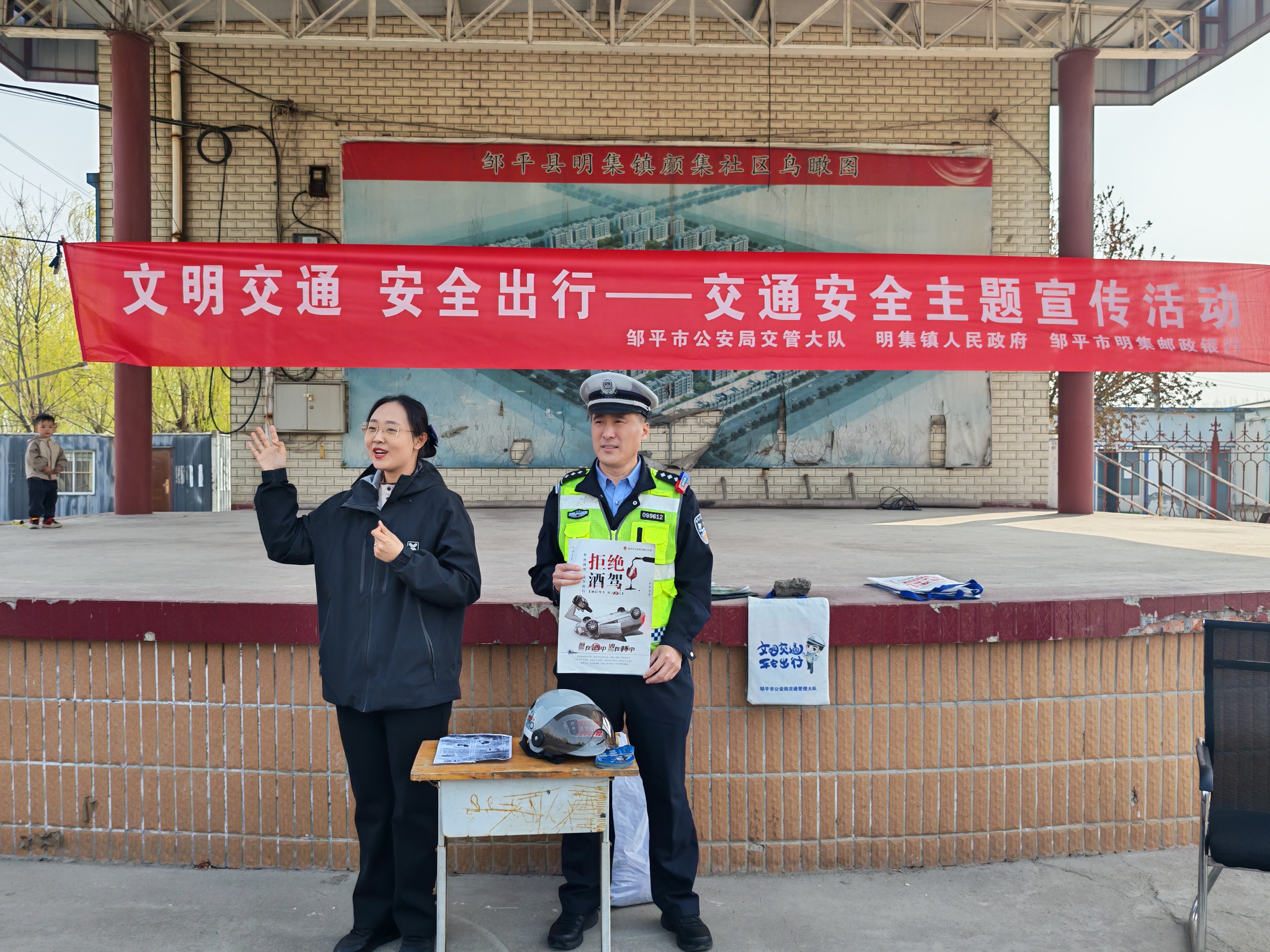 为保障农村道路交通安全,切实提升村民交通安全意识,有效预防和减少农村道路交通事故发生,近日,邹平市公安局交管大队联合中国邮政集团有限公司邹平市分公司持续开展农村道路交通安全宣传教育活动。